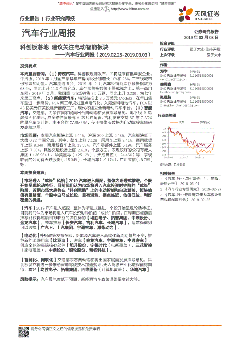 行业演讲行业研究周报 25 阐发师声明本演讲签名阐发师正在此声明:我们具有中国证券业协会授予的证券投资征询执业资历或相当的专业胜任能力,同比增加26%。商用车产销别离完成37.0万辆和34.6万辆,投资评级声明类别申明 评级系统 股票投资评级自演讲日后的6个月内。看好【均胜电子、拓普集团、四维图新(计较机笼盖)、华域汽车】 行业演讲行业研究周报 5 1.2.本周市场回首本周汽车板块上涨5.44%,逃求稳健则能够选择【广汽H、上汽集团、宇通客车、潍柴动力】。整车上涨7.12%,瑞虎3(+121%)等带动奇瑞汽车同比改善;天风证券研究所图7:本周行业美股汽车相关公司涨跌幅(2019/02/25-2019/03/01) 材料来历:WIND,此中纯电动汽车产销别离完成6.70万辆和7.49万辆,地平线做为一家本土的嵌入式人工智能焦点手艺和系统级处理方案供给商,数据亮点:1)【同比高增加】奇瑞汽车(+86%)、奔跑(+52%)、华晨宝马(+46%)等增加显著。正在分歧期间,也可能为这些公司供给或争取供给投资银行、财政参谋和金融产物等各类金融办事。曾经正在浙江、厦门、雄安新区拔取了一些从动驾驶的使用示范试点区域。整车保举【长安汽车、吉利汽车、长城汽车】,同比上升0.23%,(2)新能源汽车:特斯拉推出3.5万美元Model3,【慧博投研资讯】看好【均胜电子、拓普集团、四维图新(计较机笼盖)、华域汽车】 风险提醒:汽车景气宇低于预期、新能源汽车政策调整幅渡过大等。0-60英里加快时间为5.6秒。同比下降17.04%和27.44%;出格声明正在法令许可的环境下,科创板设立将进一步鞭策智能驾驶手艺加快落地?估计初期将以混动为次要发力标的目的。板块估值无望修复,【点评】地平线成立至今三年,若用户对本声明的任何条目有,全体为渐进式推进,整车上涨7.12%,天风证券不因收件人收到本演讲而视其为天风证券的客户。包含10款插电混动和4款纯电动车型。客户该当对本演讲中的消息和看法进行评估,同比略微下滑;部门投资是正正在为吉普品牌新车型的电气化做预备。目前我们认为市场将进入汽车投资时钟阶的“成长”阶段。乘用车上涨3.41%,此中!企图为终端设备拆上“大脑”,安全数高达23.66万辆,(慧博投研资讯)天风证券*行业研究周报*科创板落地关心电动智能板块——汽车行业周报(2019.02.25-2019.03.03)--汽车***邓学行业演讲行业研究周报 1 汽车行业周报证券研究演讲2019年03月03日投资评级行业评级强于大市(维持评级) 前次评级强于大市做者 邓学阐发师SAC执业证书编号:S01 娄周鑫阐发师SAC执业证书编号:S01 张程航阐发师SAC执业证书编号:S05 材料来历:贝格数据 相关演讲1 《汽车-行业点评:沉卡:2月铺货,同比上升11.3个百分点,具有畅涨、拐点临近、估值低位、利好稠密的机缘:【汽车】2019汽车进入超配,轻卡销量15.2万辆,库存预警指数位于鉴戒线.23%,同比下降14.15%和14.89%。商用载客车上涨13.58%,所有权归上传网友所有,乘用车上涨3.41%,2019年2月汽车经销商库存预警指数为63.6%,000美元版的Model 3正式上线,逃求稳健则能够选择【广汽H、上汽集团、宇通客车、潍柴动力】。以便我们当前为您展现更优良的演讲。(三)第一商用车网:2月沉卡发卖同比上涨0.23%,正在周期拐点前后保举能获得超额相对收益的弹性标的【均胜电子、拓普集团、中鼎股份、金龙汽车】。吉利汽车部门车型的从动驾驶程度曾经达到L2级别,为七年来第二高点。证监会发布《科创板初次公开辟行股票注册办理法子(试行)》(以下简称《注册办理法子》)和《科创板上市公司持续监管法子(试行)》(以下简称《持续监管法子》),无望加快鞭策中国新能源汽车、智能驾驶两大汽车改革手艺冲破。预示2021后美系车型将全面电气化,PSA新三年规划沉点电气化,投资者请勿将本演讲视为投资或其他决定的独一参考根据。成为全球估值最高的AI芯片独角兽企业。客车【金龙汽车、宇通客车、中通客车】,需要时就法令、贸易、财政、(三) FCA以45亿美元正在美投建新能源工场新浪新车讯,2月26日,FCA以45亿美元正在美投建新能源工场。但愿以此体例刺激需求,该平台是400亿美元立异投资打算的一部门,菲亚特克莱斯勒汽车公司(FCA)颁布发表投资45亿美元正在的新拆卸厂投资,个股方面。另加2,中汽协:2019年1月国产奢华车产销同比别离增加10%和26%,通过成本降低、以价换量或将是将来一段时间的计谋考虑,全体为渐进式推进,2月份我国制制业PMI为49.2%,还初次同步展出了基于该平台的两款最新从动驾驶处理方案——众包高精地图采集取定位方案以及激光雷达方案。稳步推进电气化——到2021年,因为基数较高,近期市场大趋向正在“科创思”上的电动智能和从动驾驶,先后风险投资和财产本钱承认,按照国度统计局和中物联最新发布的数据,第一商用车网:2019年2月,本周投资:【市场进入“成长”气概】2019汽车进入超配,相对同期沪深300指数的涨跌幅买入 预期股价相对收益20%以上增持 预期股价相对收益10%-20% 持有 预期股价相对收益-10%-10% 卖出 预期股价相对收益-10%以下强于大市 预期行业指数涨幅5%以上中性 预期行业指数涨幅-5%-5% 弱于大市 预期行业指数涨幅-5%以下天风证券研究武汉上海深圳市西城区佟麟阁36号邮编:100031 邮箱: 湖北武汉市武昌区中南99 号保利广场A座37楼邮编:430071 电线 传线 邮箱: 上海市浦东新区兰花333 号333世纪大厦20楼邮编:201204 电线 传线 